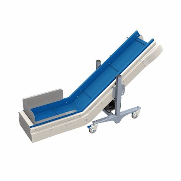 CB opgaande banden met oplegvlak hebben een robuust modulair stalen “SMS” frame, standaard verkrijgbaar in gespoten RAL 7016. De zij-geleidingen zijn geproduceerd uit een 95 mm hoog anti-frictie materiaal. Om te voorkomen dat producten tussen het loopvlak en de geleiding kunnen vastklemmen zijn deze geleidingen direct op het loopvlak gemonteerd. De aandrijfrollen zijn vervaardigd uit polyurethaan met een stalen as om een goede overbrenging te realiseren tussen aandrijfrol en transportband. De aandrijfrol is voorzien van as-tap om direct een wormwielreductor hierop te kunnen monteren. Het frame is in hoogte verstelbaar en voorzien van PU blokkeerbare zwenkwielen met een diameter van 100 mm. De motor is in een zelf-centrerende constructie opgehangen. De banden zijn verkrijgbaar in 6 uitvoeringen met 3 breedte maten en 2 schuinte lengtes en kunnen verder worden aangepast aan individuele eisen.