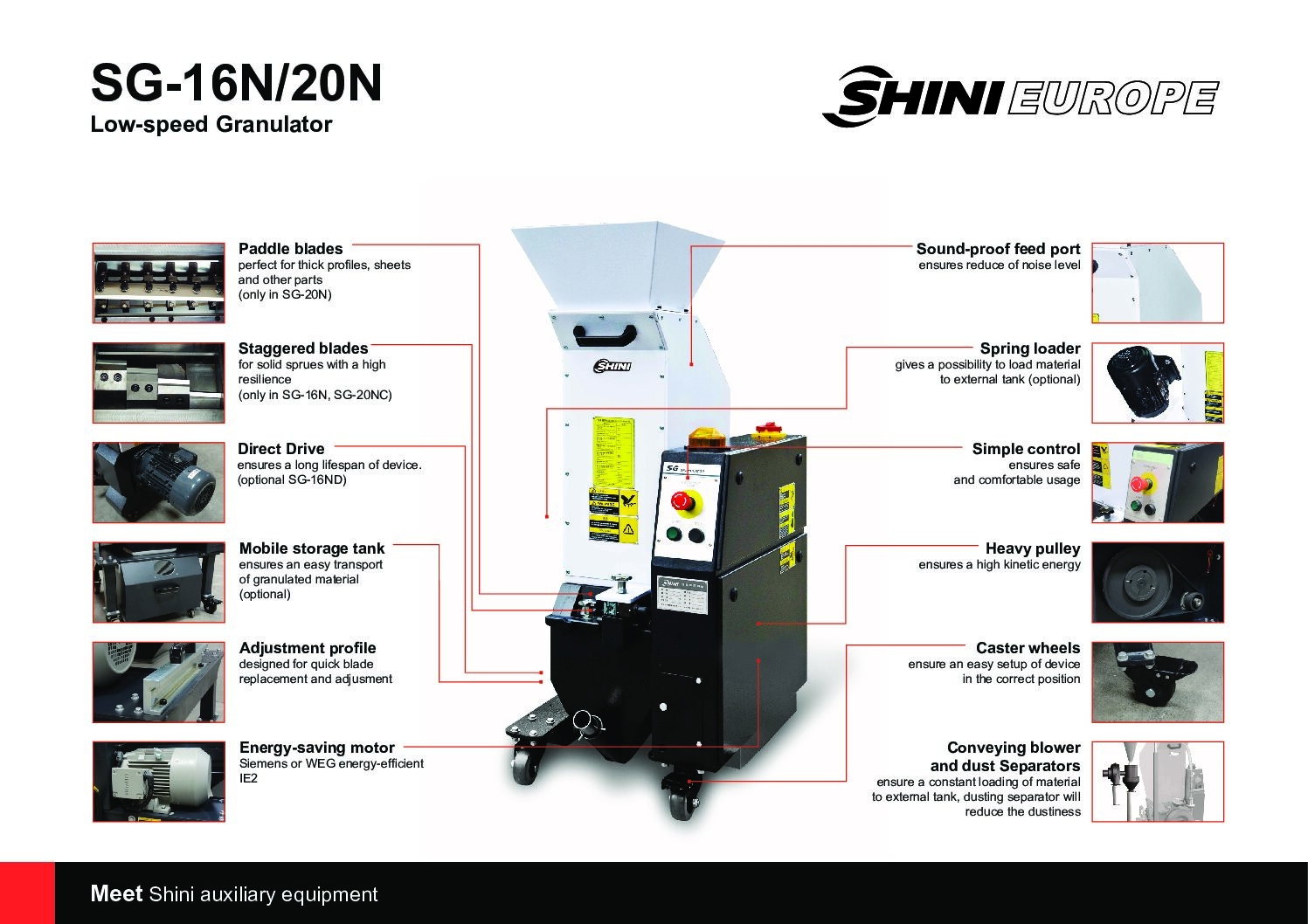 SG-16/20 serie maalmolens hebben, naar keuze, versprongen messen of messen met schoepopstelling. Deze worden voornamelijk gebruikt voor het granuleren van takken en afgekeurde eindproducten naast de spuitgietmachine. De open constructie garandeert eenvoudige reiniging en snelle wisseling van messen. Zij voldoen vanzelfsprekend aan alle CE-veiligheidsnormen. De serie kent acht modellen en is verkrijgbaar met een maximale output vari?rend van 35 tot 50 kg/u.