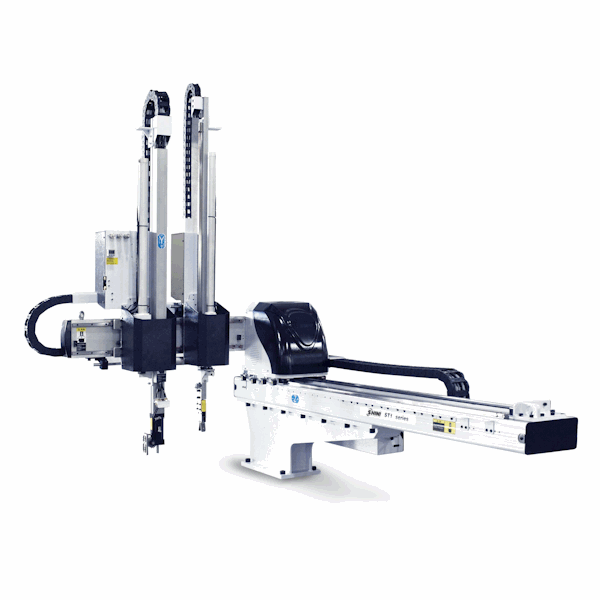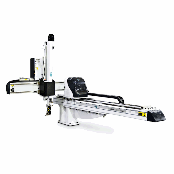ST1 serie is ontworpen voor een snelle en nauwkeurige verwijdering van aanspuittakken en eindproducten uit de spuitgietmachine en deze op de gewenste locaties te leggen. De zijwaartse beweging (Z-as) is voorzien van servo aandrijving. De voorwaartse (X-as) en verticale (Y-as) beweging zijn voorzien van pneumatische cilinders. Een stapelfunctie biedt 2 stop punten in X-en Y-as, meerdere stoppunten in de Z-as. De verticale Y-assen kunnen worden uitgevoerd met een enkele- dubbele as (D uitvoering) en met telescopische assen (T-uitvoering). De keuze hangt af van de toepassing bij twee- of drie plaat matrijzen of hotrunner systemen. Geschikt voor spuitgietmachines met een sluitkracht van maximaal 850 ton.