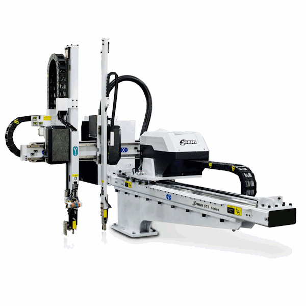 - Shini robots hebben een moderne vormgeving. De wit met zwarte kleurstelling maken deze robots een estetische verschijning op elk merk spuitgietmachine.
